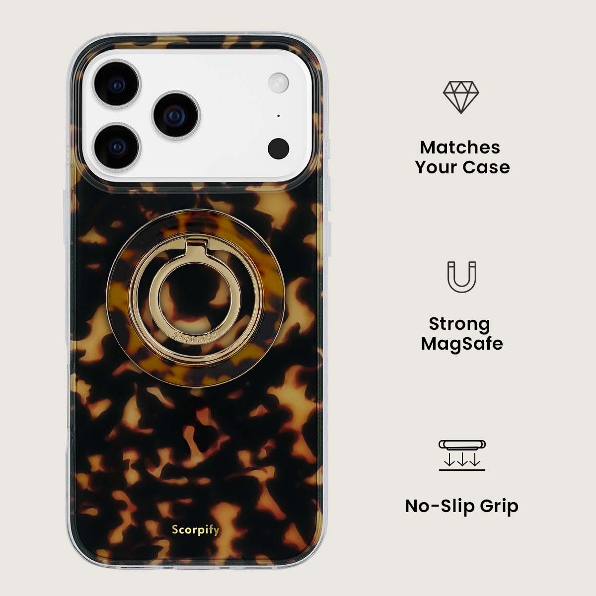 A gentle reinterpretation of a timeless pattern, the Scorpify Brown Tortoise Shell Phone Ring Holder blends warm pink hues with layered shell-inspired depth. The smooth ring design enhances grip, balance, and one-hand control, while the compact profile keeps the look light and elegant. Designed to function as a magnetic phone ring and magsafe ring holder, it offers stable handling without visual weight.