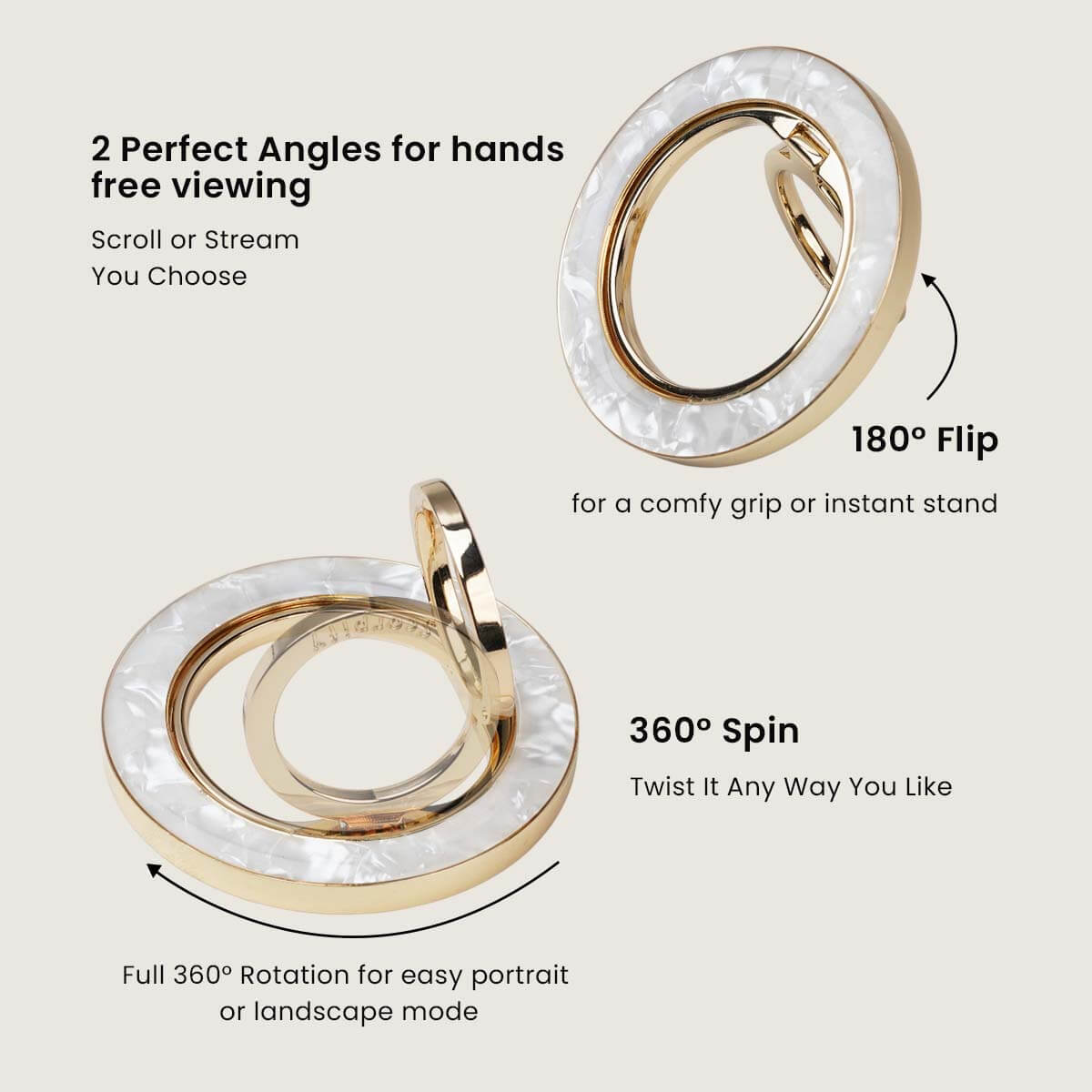 Both the White Pearl Rotating and Non-Rotating ring designs provide a comfortable hold for one-hand texting, selfies, and calls, and prop your phone up for hands-free videos, video calls, and reading.